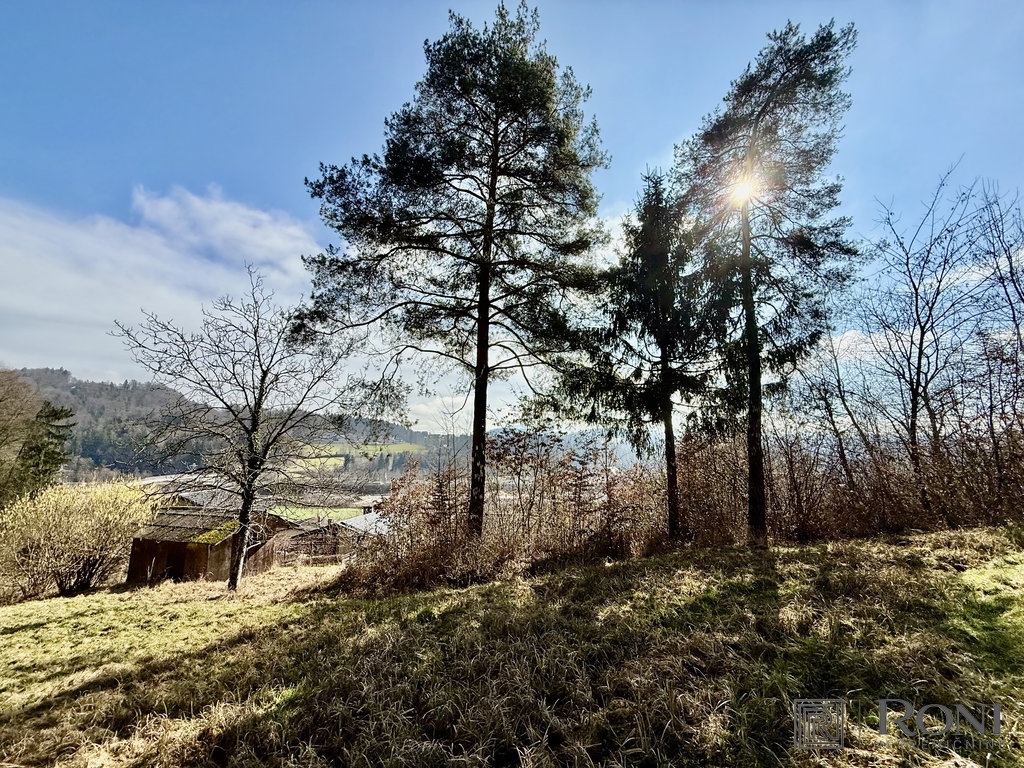 A fantastic 2,194 m² building plot (100% residential use) is available, located on the edge of the settlement right next to the forest boundary, offering beautiful views of the surrounding hills. The land is sloped with south-facing orientation. Part of the plot is grassy, while the rest is overgrown. Suitable for single-family or two-family residential construction.