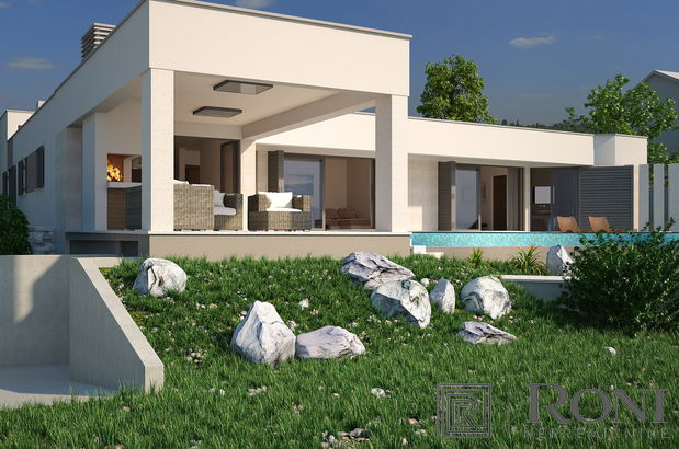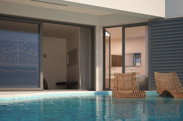 Land and villa for an investor. Villa size - 200m2, 3 bedrooms, 2 bathrooms, 1 toilet, heated infinity pool with salt electrolysis and mosaic (swimming season can spread from April to November), large openings to terrace and swimming pool, direct access to swimming pool from main bedroom, main bathroom and living room, great panoramic sea and mountain view from bath tube, whirlpool, swimming pool and terrace, SPA with sauna, whirlpool, GYM and climbing wall, two-sink bathrooms, floor heating, children's playground, 4 parking places etc.