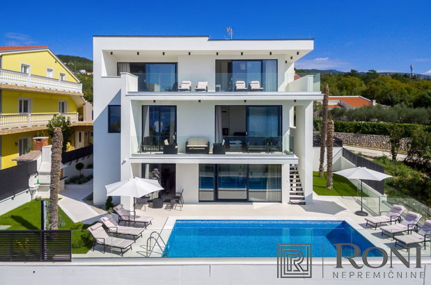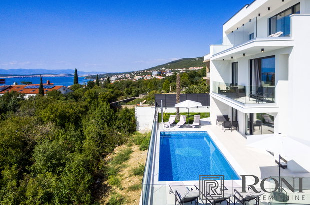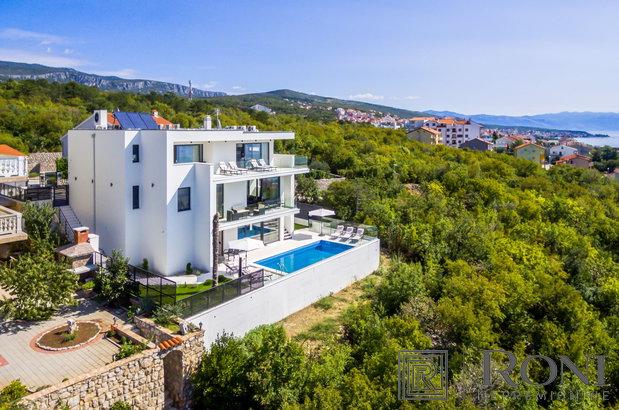 The house is located in Crikvenica, about 450 meters from the sea, was built in 2017, has all permits (construction, use), categorization for tourist rental (5 * - five stars), and the house is built of the best and most modern equipment: thermal Bosch pump, solar collectors for domestic hot water heating, 11 air conditioners, underfloor heating and underfloor cooling, Brač stone on the outside and Brač marble on the inside, Hansgrohe taps, Villeroy & Boch toilets, Dan Kuchen custom kitchen, solid kitchen Slavonian oak wood, custom tables, built-in cabinets, spring beds, video surveillance, alarm, glass railings inside and outside.