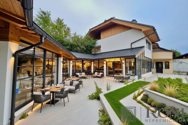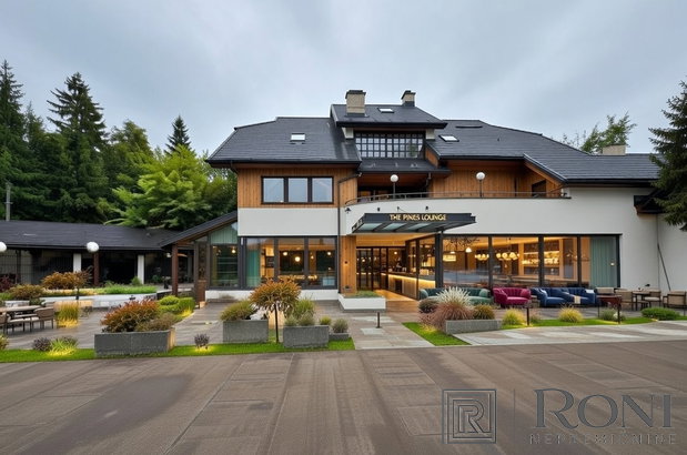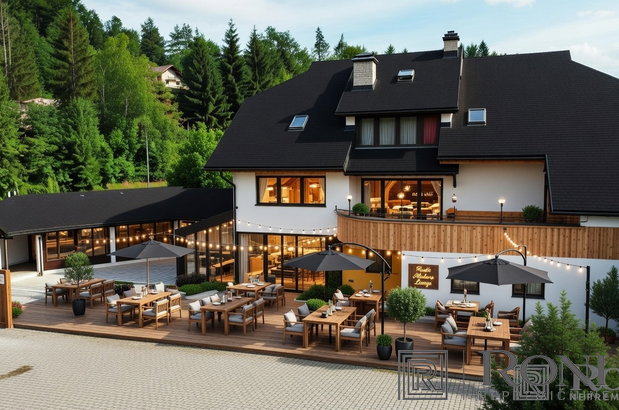 Imagine a complex transformed into a unique restaurant with a huge lounge bar where people linger for hours – from morning coffee to late-night cocktails. A sunny terrace with breathtaking views of forests and surrounding hills. On the lower, green part of the property: luxury glamping – wooden cabins or elegant tents with private terraces, fire pits, and jacuzzis under the stars.