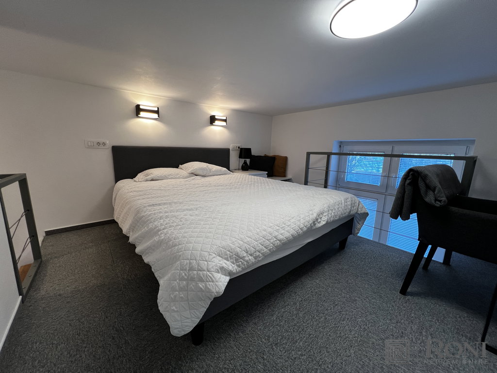 Inovativen tloris: Izjemen izkoristek višine s spalnico v galeriji, ki se dviga nad dnevnim prostorom in ustvarja občutek ločenost bivalnega in spalnega dela.