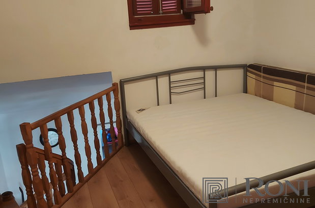 V zgornjem nadstropju je velika splanica z zakonsko posteljo ter eno otroško posteljo. Stanovanje ima skupaj ležišč za 8 oseb.